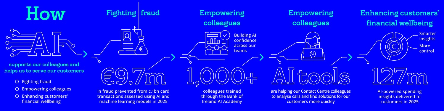 Over 1,000 colleagues trained through the Bank of Ireland AI Academy in 2025. This initiative has empowered employees with AI knowledge and fostered a culture of continuous learning. As they embrace the future, these colleagues are well-equipped to drive the bank's digital transformation, ensuring it remains at the forefront of the industry.